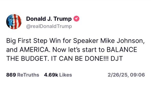 Twitter/X Feb 28, 2025, The Oligarchy's Rule No.1 of Political Rhetoric: Announce budget-balancing before increasing the debt limit and then continue with deficit-spending/money-creation